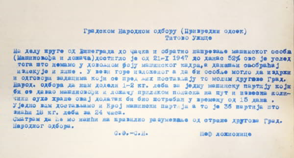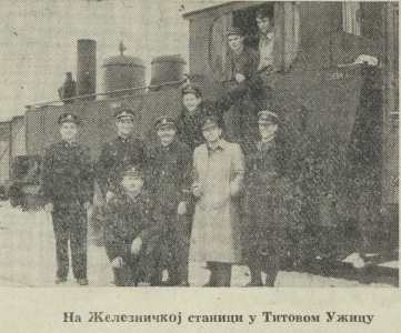 Na predlog drugova rukovodilaca stanice, sekcije i ložionice i na osnovu zapažanja komandanata iz vojske, komandant železničke mreže užičkog područja, javno je pohvalio najmarljivije radnike i pregaoce: Celokupno osoblje ložionice zato što se u najvećem broju javlja na svoju dužnost, što je uveliko raskrčilo ruševine ložionice i prikupilo veće količine dragocenog alata, i što su sopstvenom inicijativom preduzeli radove za opravku jednog pešačkog mosta. Od osoblja železničke stanice i sekcije pohvaljeni su: Nešović Ratomir, Mlađenović Sredoje, Klopanović Mirko, Vitić Milija, Zdravković Petar, Gojko Ijačić, Jovo Tripković, Kojović Dušan, Đapović Jevrem, Zelenović Spasoje, radnici 45-te i 46-te družine sekcije za održavanje pruge, Uroš Jokić, Ratković Manojle i Medan Radomir.“