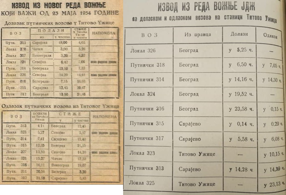 S obzirom na veliko angažovanje voznih sredstava u teretnom saobraćaju, u prvoj deceniji po oslobođenju saobraćao je samo par vozova ka Beogradu, odnosno Sarajevu. Od sredine pedesetih godina Užice je sa Sarajevom povezano sa dva putnička i jednim brzim vozom, a u red vožnje uvršetni su i lokalni vozovi do Sevojna, Čačka i Višegrada. Od Užica do Sarajeva putnički vozovi su stizali za nepunih osam časova, brzi vozovi za sedam sati.